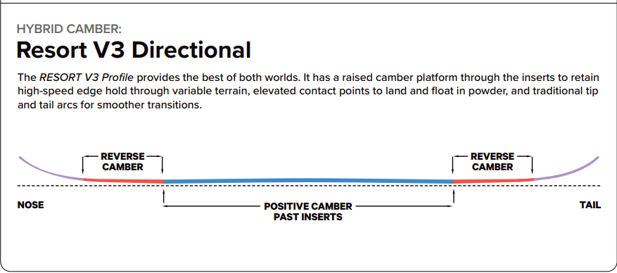 Resort V3 Directional – The RESORT V3 Profile provides the best of both worlds. It has a raised camber platform through the inserts to retain high-speed edge hold through variable terrain, elevated contact points to land and float in powder, and traditional tip and tail arcs for smoother transitions.